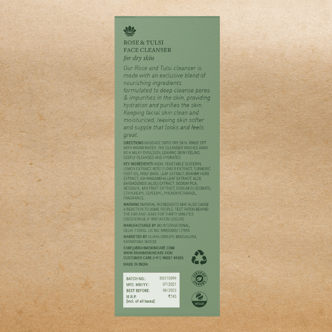 Nourish and hydrate your dry skin with our Rose and Tulsi Face Cleanser. Infused with Brahmi, turmeric root, and tulsi oil, it provides a gentle yet effective cleanse. Satisfaction guaranteed!